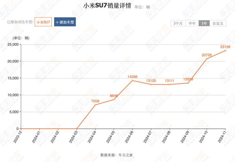 凭借雷军的个人魅力和小米SU7的产品亮点,小米SU7自从4月交付至今累计销量超过11万辆。其中,11月小米SU7凭借2.3万辆的成绩,已经成为11月国产造车新势力轿车榜第一名,并且与第二名拉开了超过1万辆的巨大差距。