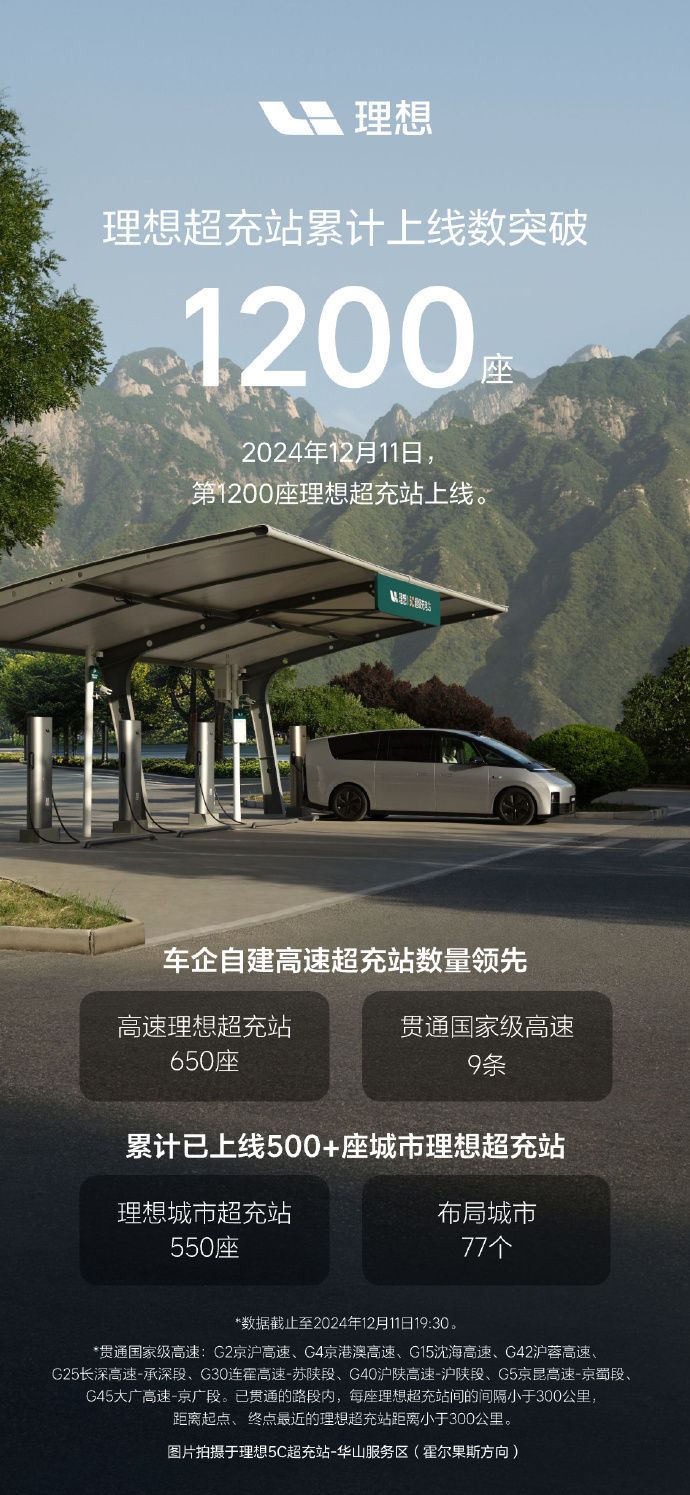 此前,在12月5日,理想汽车宣布,全国理想超充站突破1100座,高速理想超充站突破600座。