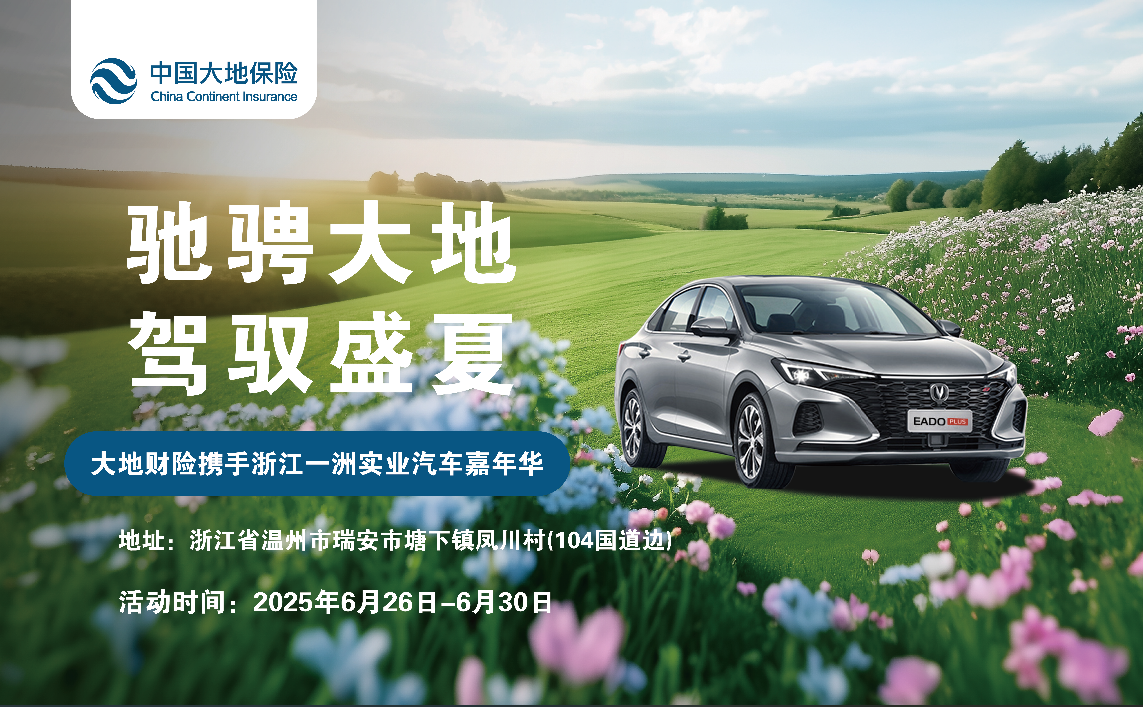 购车嘉年华,优惠不打烊!大地财险携手浙江一洲实业汽车4S店于2025年06月26日至2025年06月30日9:00-17:00在浙江省温州市瑞安市塘下镇凤川村(104国道边)举办一场汽车嘉年华。
