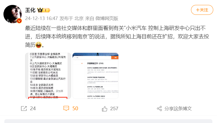 12月13日,小米公关部总经理王化发文称,最近陆续在一些社交媒体和群里面看到有关“小米汽车控制上海研发中心只出不进,后续降本统统移到南京”的说法,据他所知上海目前还在扩招。