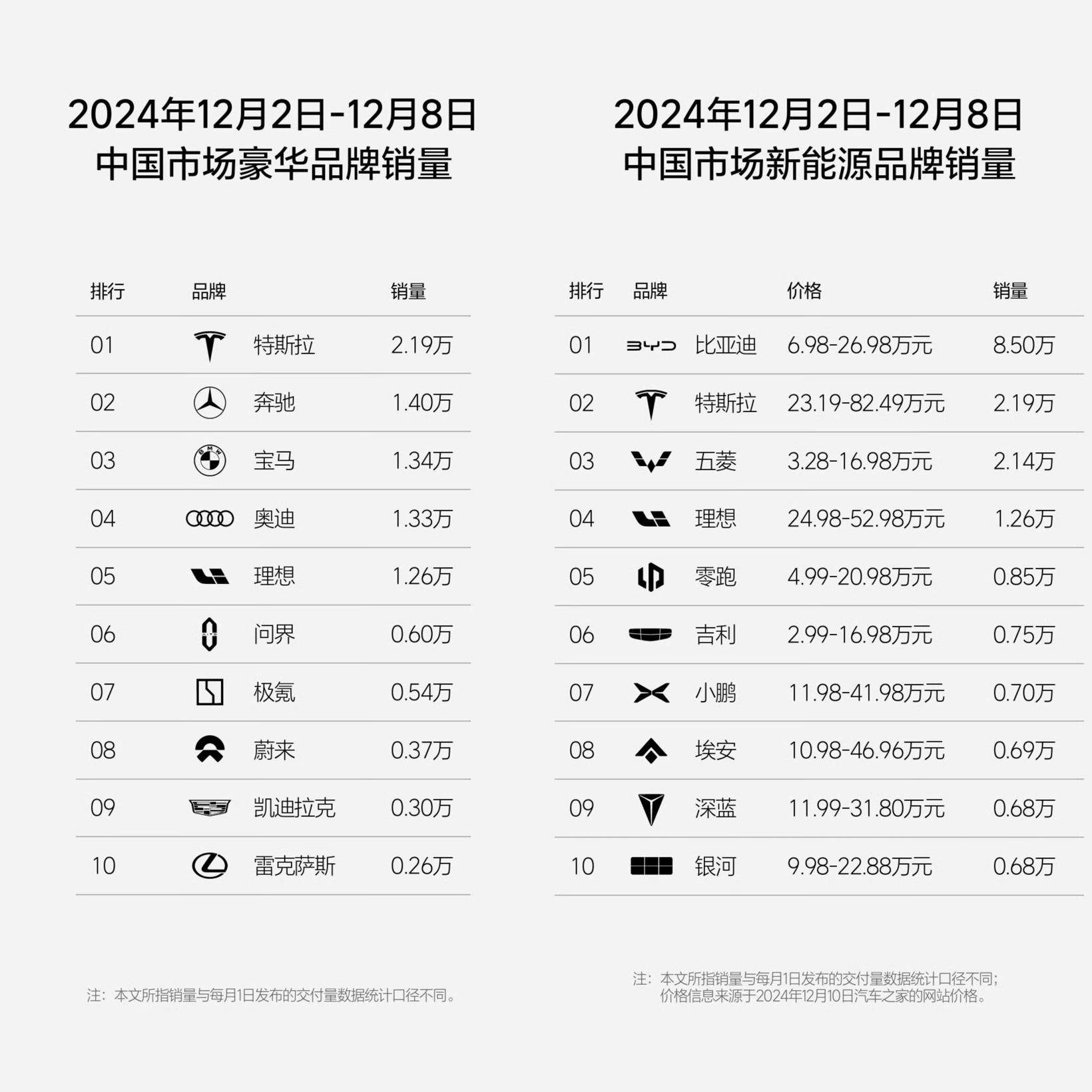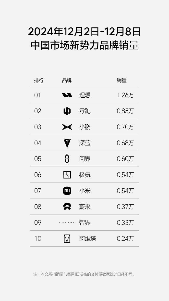 12月10日,理想汽车发布了2024年第48周(12月2日-12月8日)的销量榜。