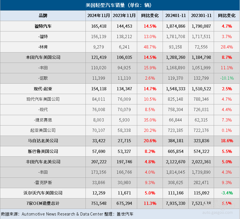 今年11月份,公布月度销量的7家汽车制造商在美国市场的交付量总计同比增长了11.3%,因为不断增加的新车库存以及一系列促销和年终优惠正吸引消费者购买汽车。