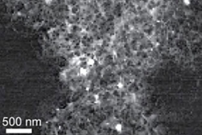 STEM成像显示从稻壳灰中去除硅后留下的多孔碳网状物(图片来源:密歇根大学)